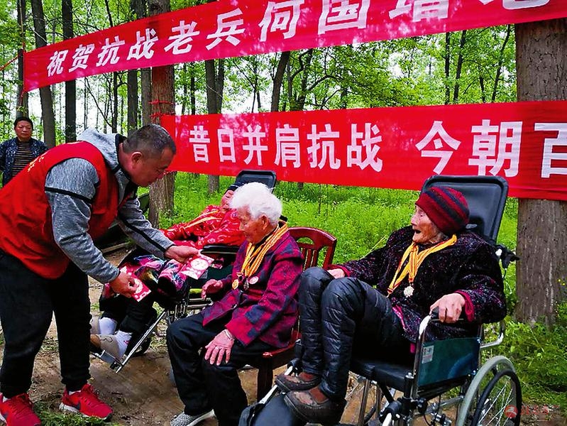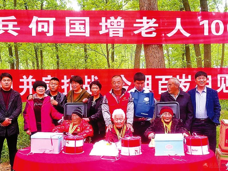本报讯 “祝你生日快乐,祝你生日快乐…… ” 4月20日上午10时, 确山县石滚河镇何大庙村前何庄抗战老兵何国增老人家门前的树林内, 在千余名乡亲和亲朋好友的深情祝福中,何国增老人和她的两名战友董花、 周荣清一起度过自己的百岁生日。 当歌声响起时, 三位老人激动得热泪盈眶,不约而同举起右手向大家敬军礼。