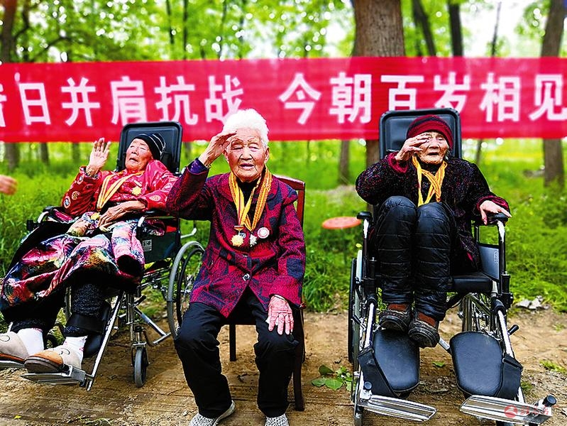 听着声声祝福, 三位老人不约而同地举起右手向大家敬军礼。 随后, 她们历经沧桑的手再次紧紧握在一起。