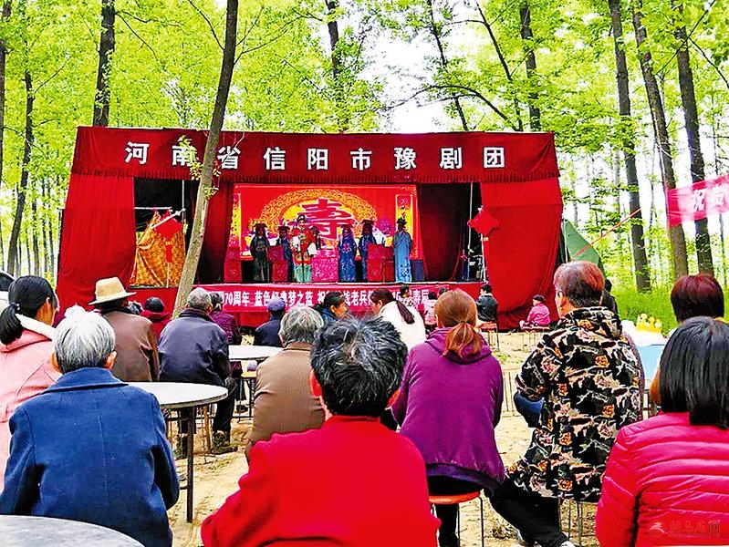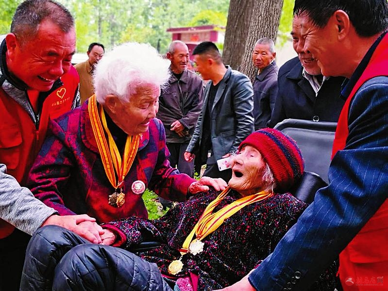 何国增老人的儿子请来剧团唱大戏, 庆祝母亲百岁生日之际与战友喜相逢。 附近十里八村的千余名乡亲也纷纷赶来为三位老人送祝福。