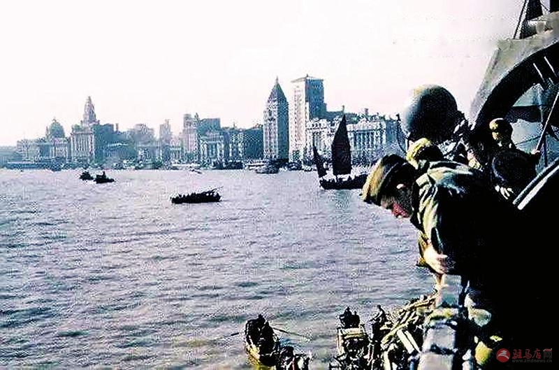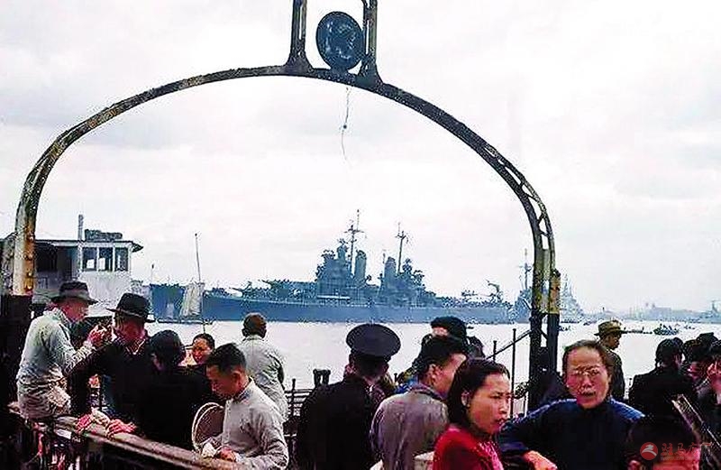 1945年, 上海, 从美国运输舰上看到的外滩和黄浦江景象。威廉 · 迪柏/摄