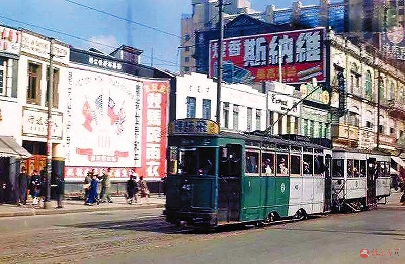 1945年, 上海, 南京东路上的有轨电车。街边那张巨型广告画, 绘的是中国、 苏联、 英国和美国的旗帜, 以及 “庆祝抗战胜利, 庆祝世界和平” 的标语 。艾伦 · 拉森/摄