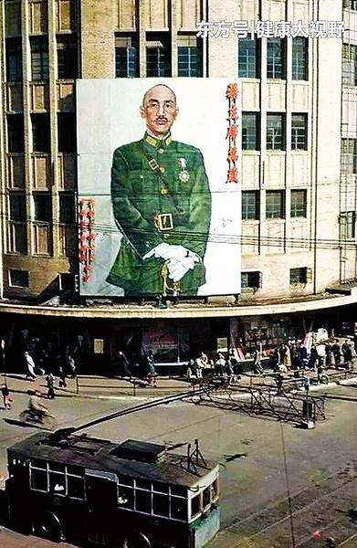 1945年, 上海, 抗战胜利后的大新百货公司 (今第一百货大楼) 大楼墙上的蒋介石肖像。艾伦 · 拉森/摄