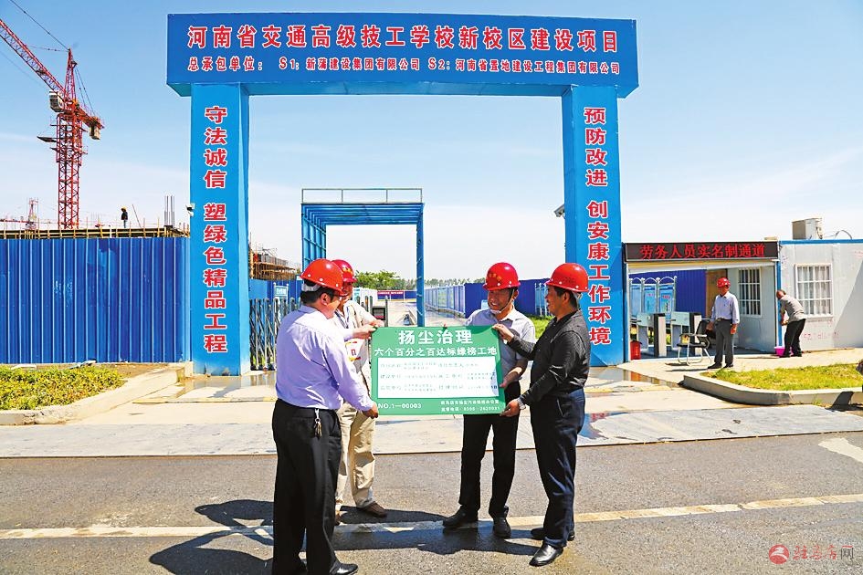 本报讯 近日,在河南省交通高级技工学校新校区施工现场,市住建局、市城管局负责人一同将印有“扬尘治理六个百分百达标绿榜工地”的荣誉牌授予该工地(如图)。