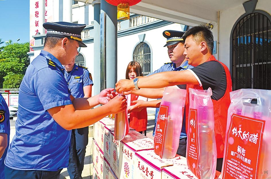 活动中,广东天地壹号饮料销售股份有限公司代表为执法队员发放了苹果醋饮料,并对城市管理一线执法人员在高温下坚守岗位表示感谢。
