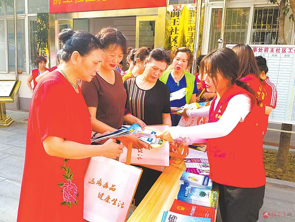 通讯员何水莲文/图本报讯6月26日是国际禁毒日。当天下午,在驿城区西园街道前王社区,2019年市妇联普法志愿者法治文化基层行活动启动仪式暨“健康人生,绿色无毒”禁毒宣传教育活动举行。