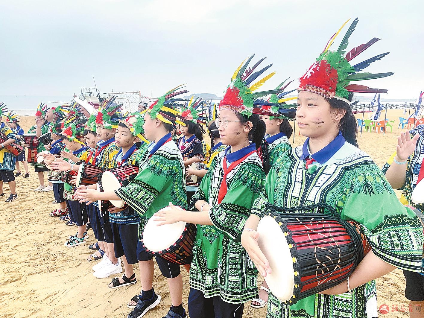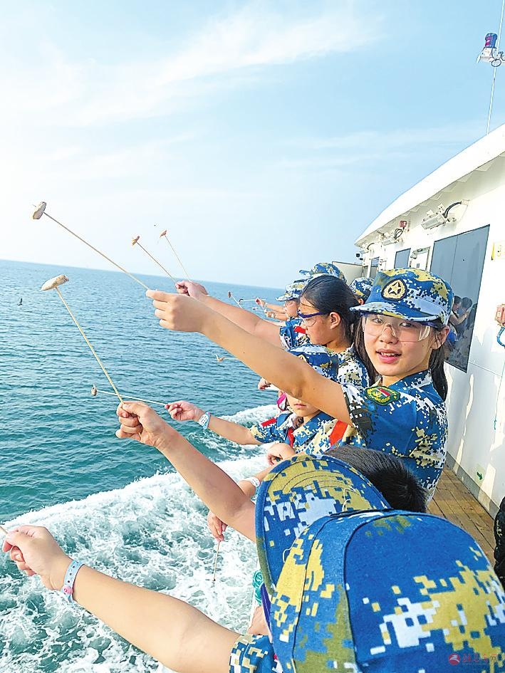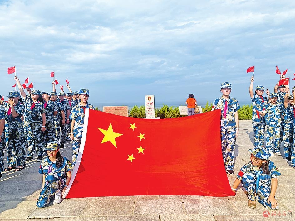 小记者们来到祖国的领海基准点界牌前合唱《我和我的祖国》,抒发对祖国的热爱,立志成才,报效祖国。