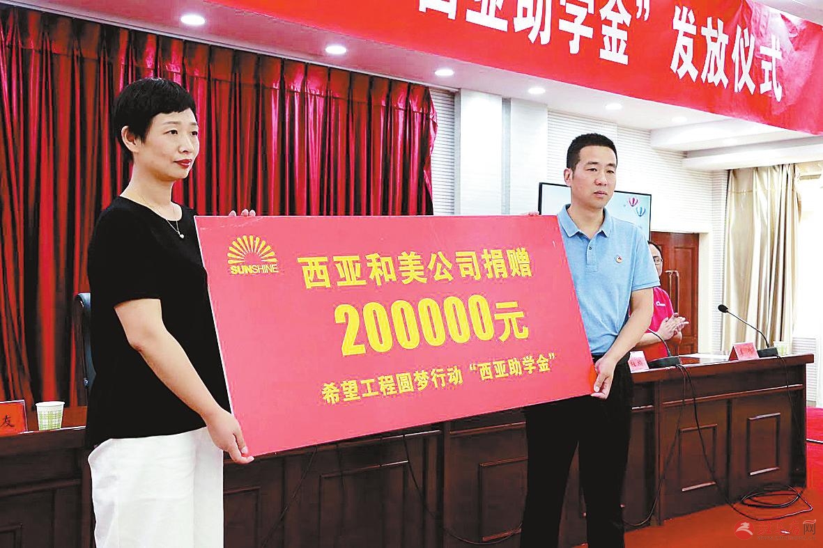 8月23日,2019年驻马店市希望工程圆梦行动“西亚助学金”发放仪式举行。西亚和美商业股份有限公司为希望工程圆梦行动捐赠20万元助学金。