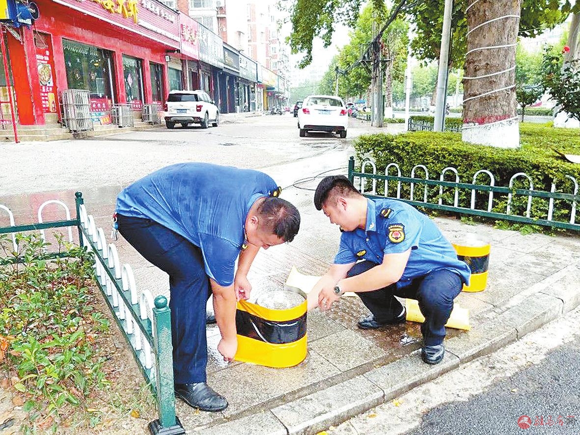 本报讯 为将精细化城市管理这一理念落到实处,开发区城市管理局始终坚持在精细管理上下功夫,通过做实、做优、做美城市管理细节,有效提升城市环境品质。8月21日,开发区城市管理局工作人员在日常巡查中发现辖区人行道挡车桩反光贴陈旧、破损,不仅影响城市美观,还存在一定的安全隐患。为此,开发区城市管理局迅速组织10余名工作人员,冒雨对破损陈旧的反光贴进行更换(如图)。