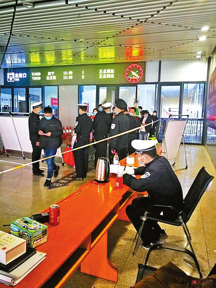在出站口的境外返乡人员登记处,执勤民警们组织旅客依次测量体温、登记信息、消毒等(如图),现场繁忙且有序。在场一执勤民警坦言,为了实现我市“外防输入”目标及做好清明节安保工作,他们在执勤卡点吃泡面、睡地铺都不算什么,只是希望境外返乡人员能为了自己和他人的安全,主动申报出入境真实情况,避免造成安全隐患。