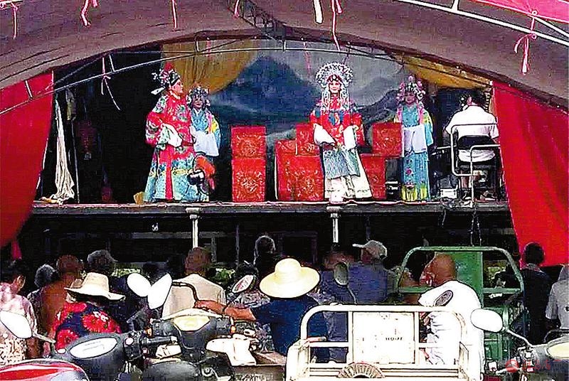 演出现场, 台上演员唱念做打一丝不苟, 台下观众摇着扇子听得津津有味。