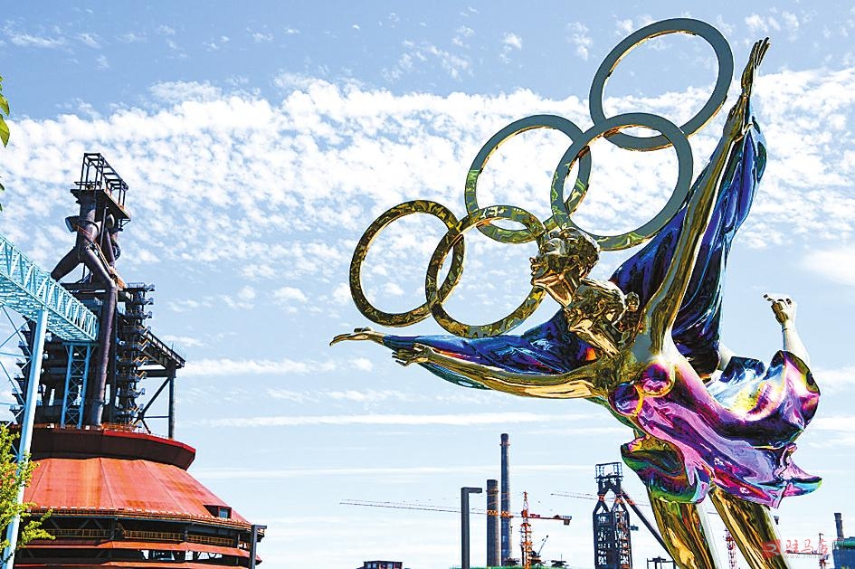 8月24日,在蓝天白云掩映下的北京市首钢园里,雕塑作品《冬奥之约》与首钢工业遗迹遥相呼应。