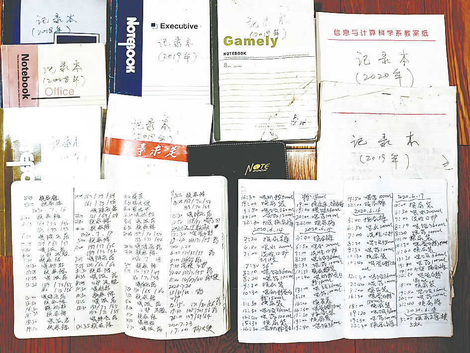 徐亚力和弟弟一替10天轮流值班,两位老人一天5顿喂饭,两个小时一次翻身,4个小时观察一次大小便以及擦澡、理发、洗头、刮胡子、剪指甲……都是兄弟俩亲力亲为。每天的饭量、服药、医嘱、血压变化、血氧含量、大小便特征等,都要认真地记录在值班日志上,既为医生诊疗时提供详细而准确的基础数据,也作为兄弟俩交接班时掌握更多的信息。服务两位老人的听诊器、血压计、吸痰器、吸氧机等配置得一应俱全。3年多来夜以继日侍奉二老,徐亚力和弟弟的临床护理水平,已不亚于一个熟练的专业护理人员。
