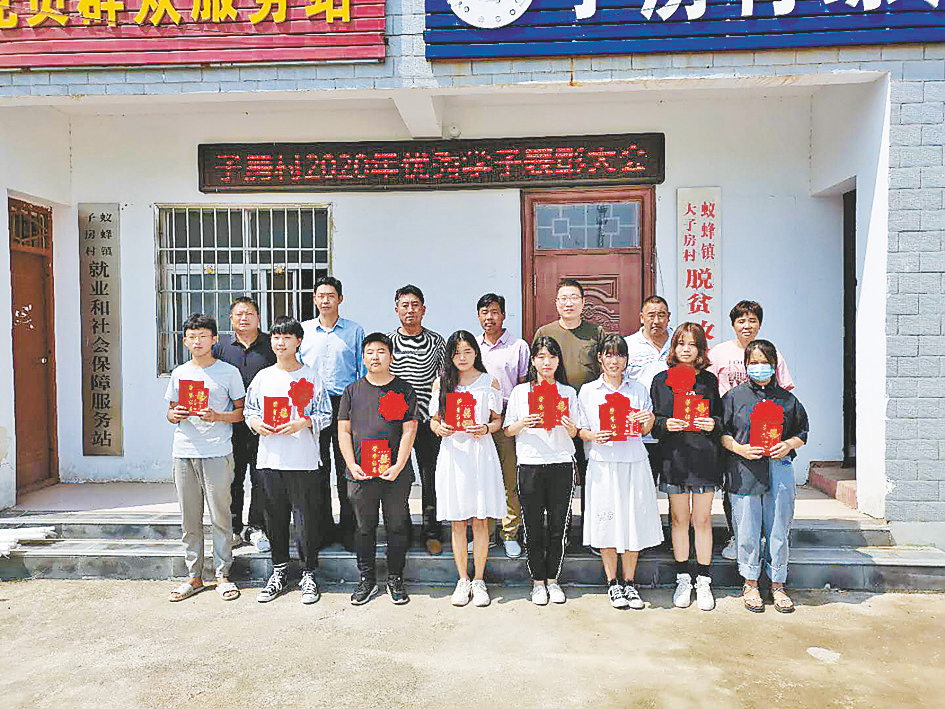 本报讯(文/图 全媒体记者 高琳琳)近日,驿城区蚁蜂镇大子房村组织召开了“树立全村榜样、表彰优秀学生”大会,为村里今年考上本科院校的8名优秀学生颁发荣誉证书,并给每位学生发放一个鼓励红包(如图)。