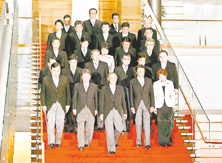 16日,在东京首相官邸,日本首相菅义伟(前排中)率阁僚走下楼梯。
