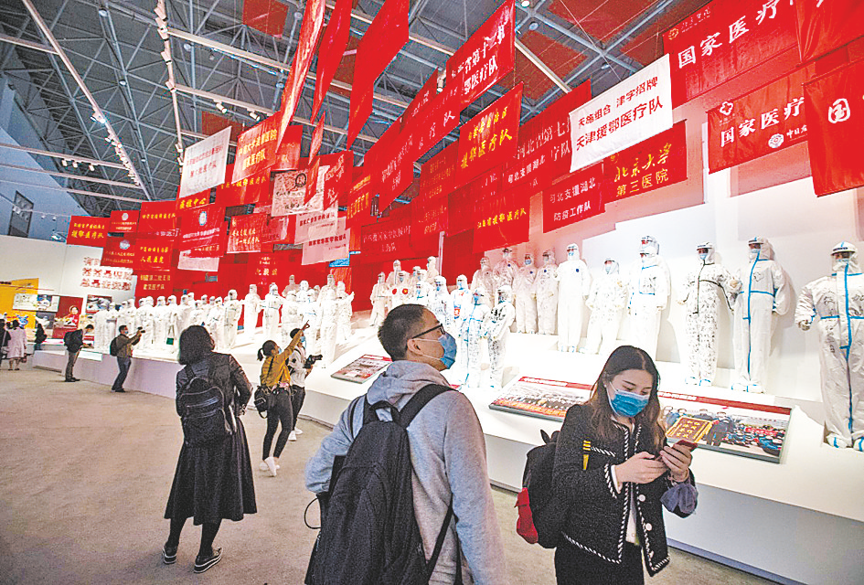 10月15日,人们在抗击新冠肺炎疫情专题展览上参观。