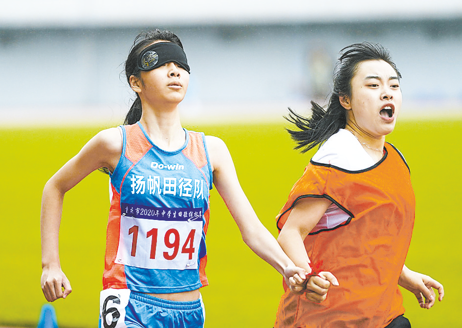10月14日,来自重庆市特殊教育中心的视力残疾运动员蒋雯雯(左)和领跑员黄秋在重庆市2020年中学生田径锦标赛视力残疾组女子200米比赛中。
