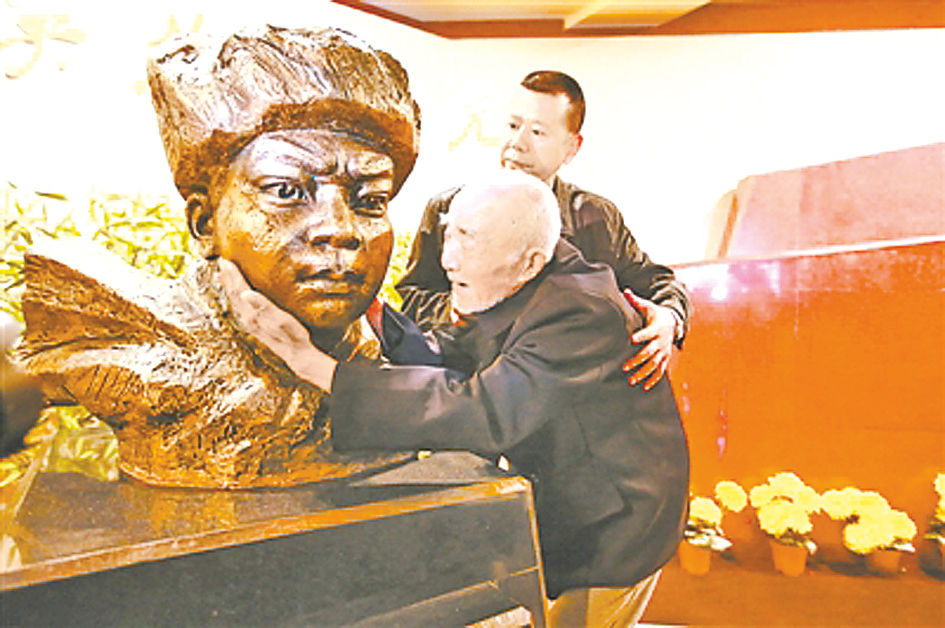 李继德老人参观黄继光纪念馆,抚摸着黄继光雕像激动不已。
