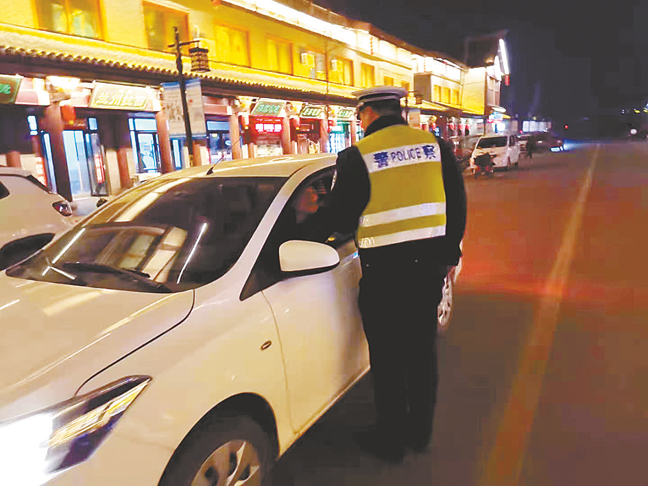 新年第一天,尽管阳光相伴,气温依旧很低。1月1日早晨7时30分,市交通管理支队示范区交警大队民警以严整的警容、饱满的精神、崭新的面貌有条不紊地做好路面执勤工作。执勤民警辅警对辖区结冰路段进行撒盐化冰,对事故现场进行保护并疏导交通,对酒驾醉驾、货车闯禁行等各类交通违法行为进行查处(如图),对出行群众进行交通安全宣传,确保辖区道路交通秩序平稳有序。
