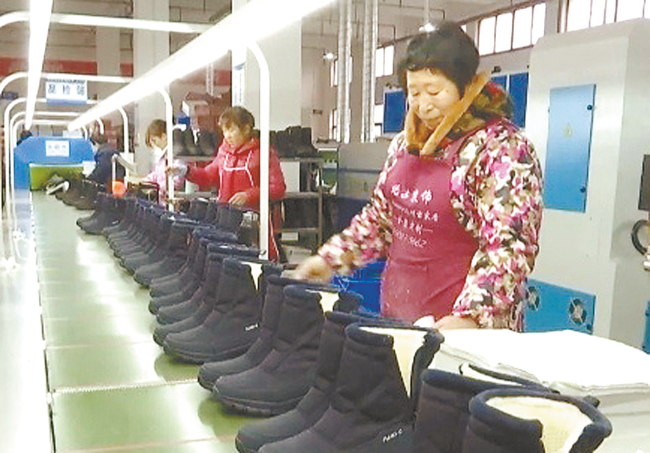 1月2日,上蔡县产业集聚区河南际东鞋业生产车间里,一派热火朝天的生产景象(如图),近百名工人在车间生产线上熟练地操作冲孔机、压扣机、喷胶机等机器,一批批棉靴将从这里销往世界各地。