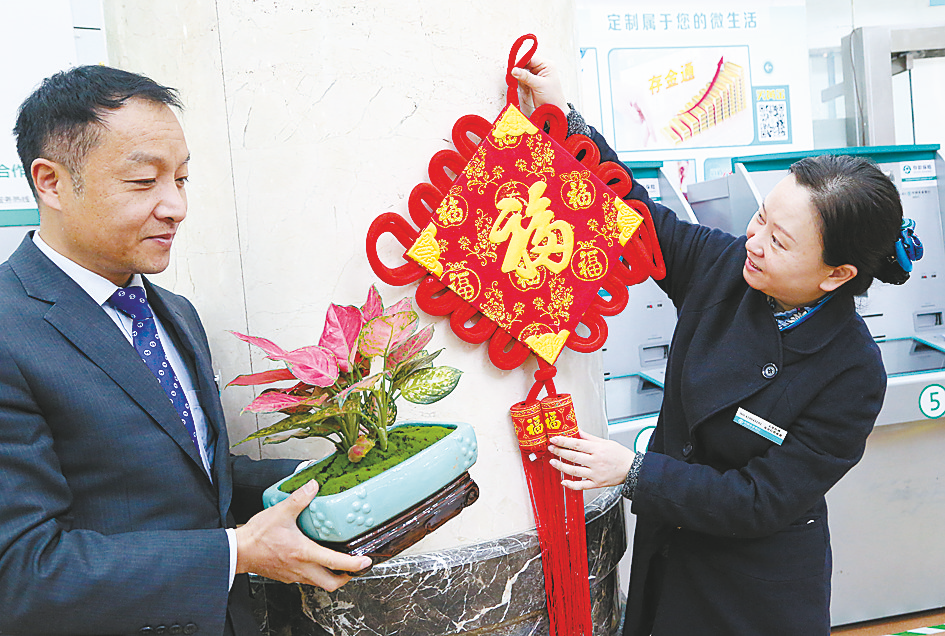 为营造欢乐喜庆的氛围,近日,农行驻马店分行对营业网点进行了亮化美化,对网点环境进行清洗,在柜台悬挂灯笼、中国结等节庆物品,以优质的服务迎接客户,展示农行人的精神面貌。