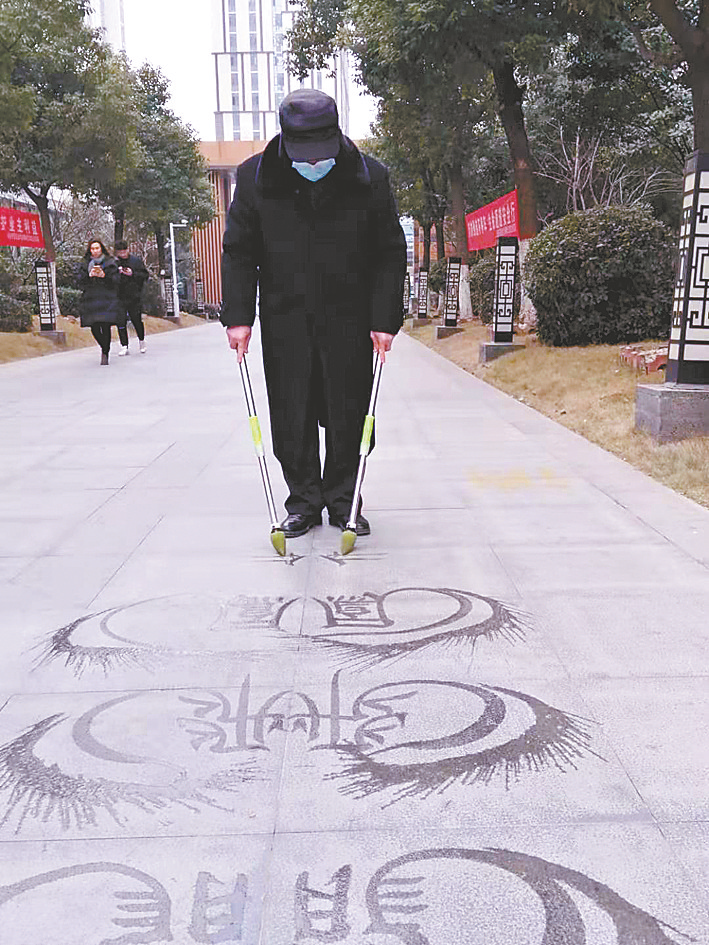 本报讯(文/图 全媒体记者 李贺建)1月17日,在建业十八城小区内,一位老人用大笔在院内道路上双手写字的场景吸引了来往居民的注意(如图)。