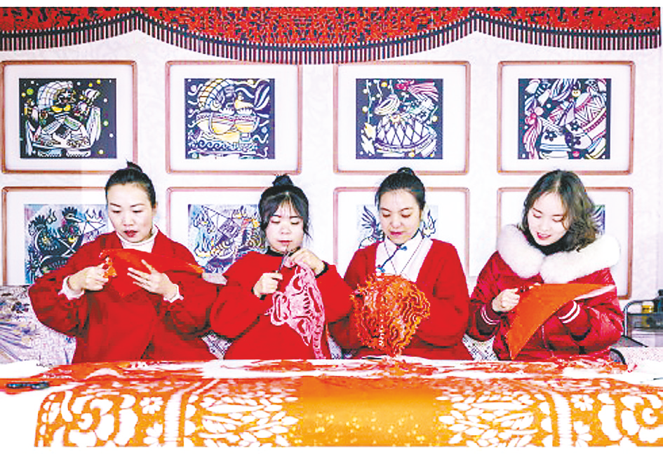 1月17日,岳红霞(右二)带领工作室学员创作“金牛送福”剪纸。