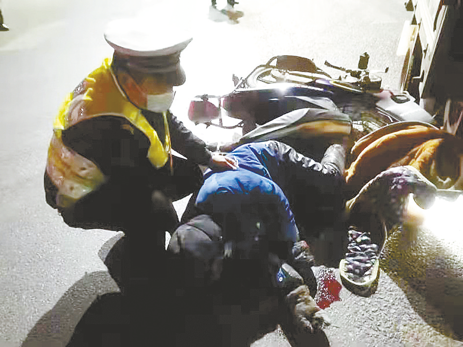 1月19日晚上8时许,驻马店市交警支队示范区大队大气污染防治卡点辅警马向辉、乔俊岭,在市区雪松大道与嫘祖大道交叉路口执勤过程中,突然听到一声异响。他们循声望去,发现路口东北角一辆两轮摩托被一辆三轮摩托车死死压着,旁边有一个人躺在地上。