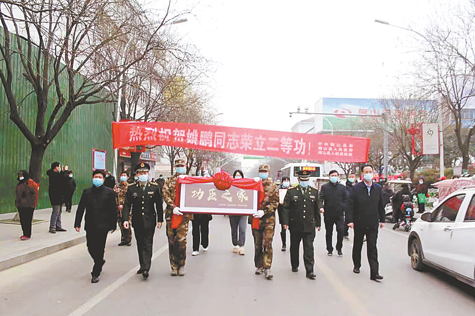 本报讯(文/图 通讯员 王静)为弘扬拥军优属的优良传统,激发广大青年参军入伍的热情,1月21日,伴随着喜庆的锣鼓声,由确山县委常委、人武部政委殷玉金,人武部部长李建和退役军人事务局主要领导及工作人员等组成的送喜报队伍,举着长长的红色横幅、抬着醒目的“功臣之家”匾牌,一同来到确山县盘龙镇和平街(图一),为确山县荣立二等功的现役军人