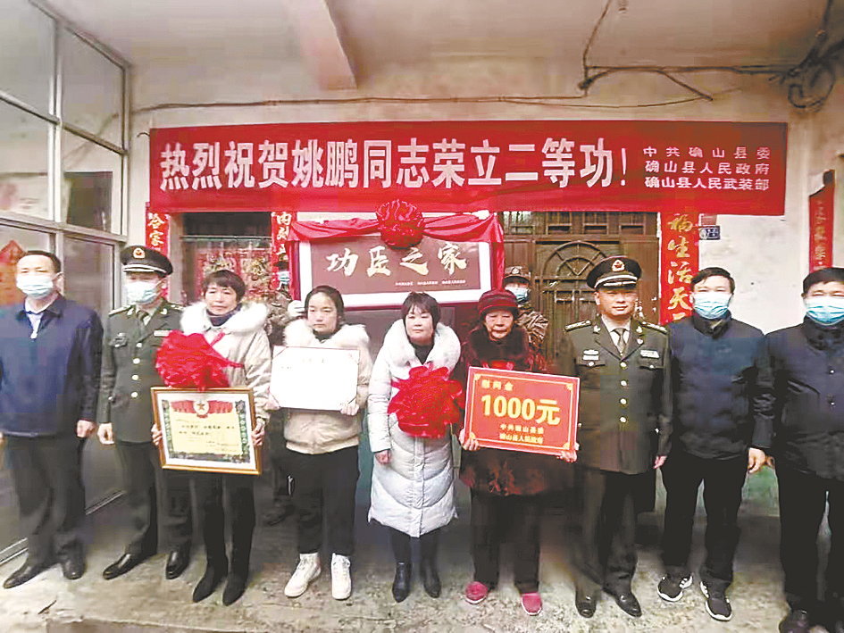 一人立功,全家光荣。在阵阵喜庆的锣鼓声中,县领导将立功喜报、证书和奖章送到姚鹏父母手中,并对姚鹏荣立二等功表示祝贺,感谢他的家人对国防事业的支持。姚鹏父母表示对儿子在部队的表现很欣慰,感谢部队的培养和地方党委政府的关心,希望儿子在部队更加努力,做一名出色的军人,为祖国争光。