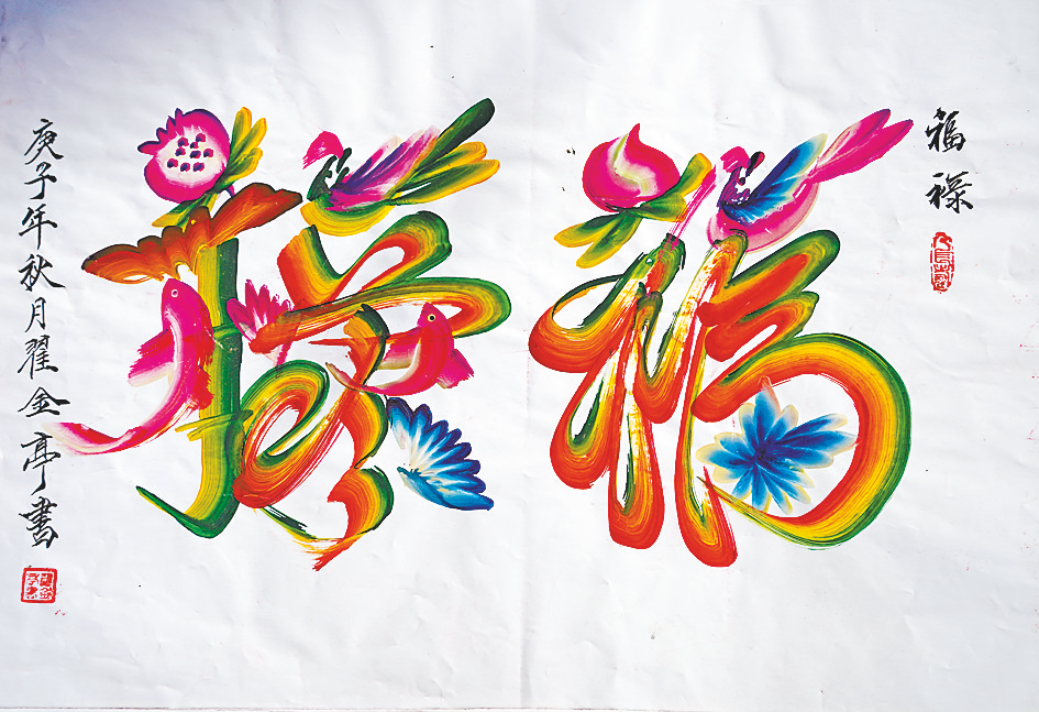 据翟金亭介绍,将柳木根劈片后,经蒸煮、锤砸、针剔、打磨等十几道工序形成扁形板笔,书写时笔如板刷,浸墨着色,墨韵丰富,柔刚相济,耐人寻味。书写时可着素墨,亦可一笔同着三色,相互浸融,韵味十足。以笔画部首勾画花、鸟、虫、鱼、草组成汉字,字体架构清晰、亮丽,画中成字,字中有画,构思独特,惟妙惟肖,浑然天成。一笔一字,一挥而就,由家具纹饰演变为大中堂,条屏、横幅等作品,章法有序,雅俗共赏,表现出独有的艺术特色。