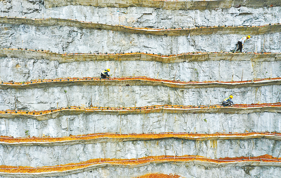 在广西柳州市楼梯山山体复绿工程施工现场,有一群忙碌在峭壁上的“植绿人”。他们通过搭建钢筋混凝土V型槽和混喷的方法,在陡峭的石头山上开辟出了一片片“梯田”,回填泥土后种植石山紫薇、夹竹桃、三角梅等进行绿化,并在“梯田”搭建供水供养料的管道,以利于植物生长。经过工人们的努力,楼梯山山体重新披上绿装。