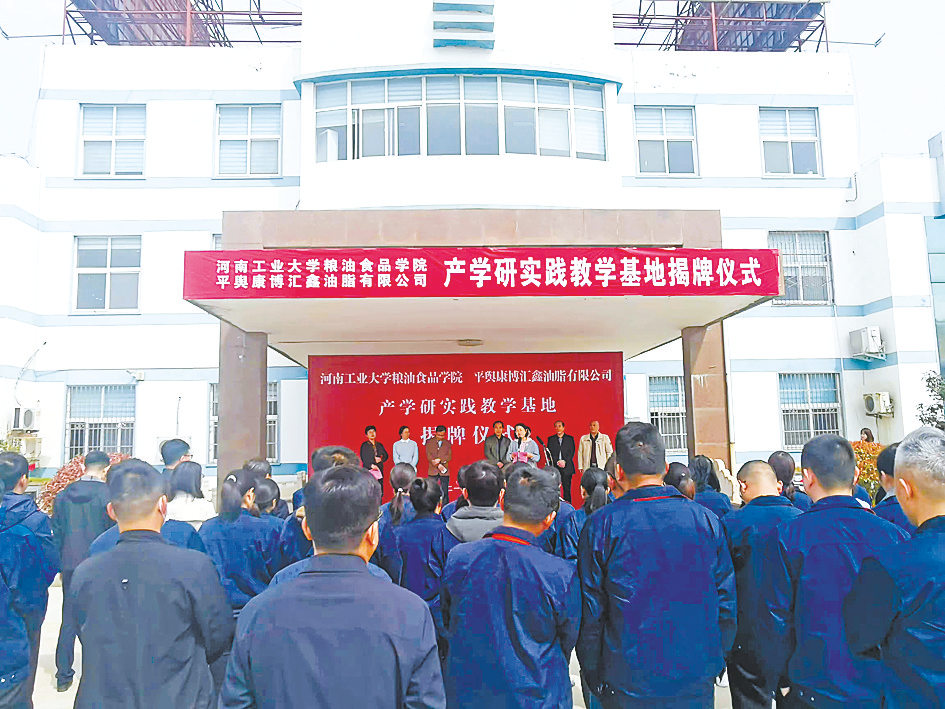 本报讯(文/图 全媒体记者 薛顺启通讯员 冯磊)3月30日,河南工业大学粮油食品学院与平舆康博汇鑫油脂有限公司(以下简称康博汇鑫)在平舆县康博汇鑫厂区举行“产学研实践教学基地”揭牌仪式(如图)。该基地的成立,成为校企进一步加强联系的纽带,将有力助推社会经济高质量发展。平舆县政府相关领导、河南工业大学粮油食品学院负责人及教授代表出席揭牌仪式。