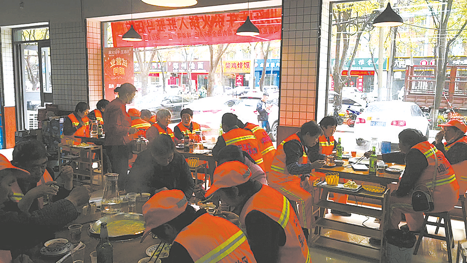 本报讯(文/图 全媒体记者 栗晨曦 实习生 毕煜 王震 徐佳红)4月14日,对于市开发区的26名环卫工人来说,是一个充满爱的日子。这一天,位于市区金雀路与文祥路交叉口西两百米处的川东王牛杂火锅店老板牛鑫要请他们吃火锅。