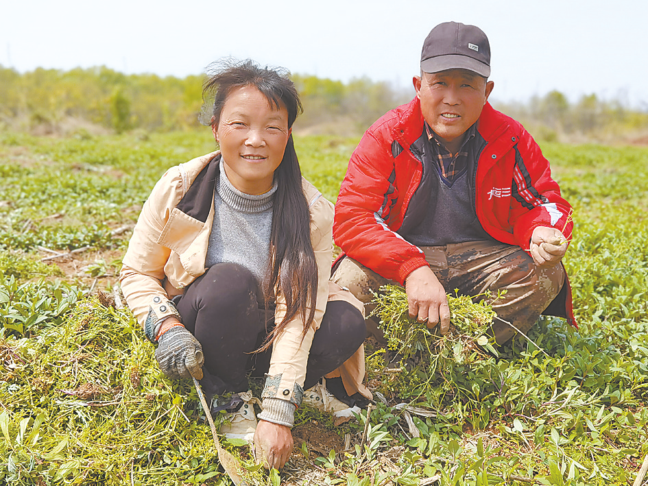 今年雨水充沛,夏枯草长势喜人。近日,在确山县石滚河镇南王楼胡岗村,村民李春民和妻子彭水红在地里拔草。他家今年种了10亩地夏枯草,预计又是一个丰收年。 (见习记者 衡卫萍)