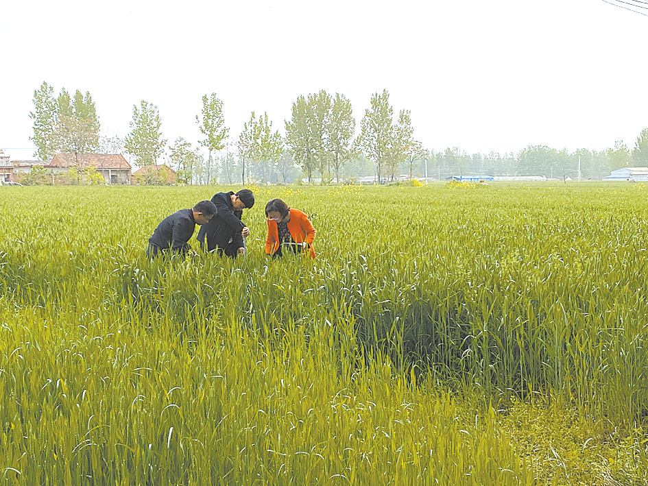 驿城区气象局工作人员深入田间查看小麦生长情况。