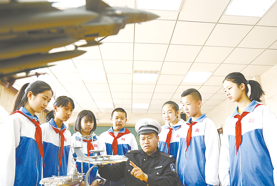 4月15日,在河北省邢台市第二十八中学,民警利用模型给学生讲解国防武器知识。