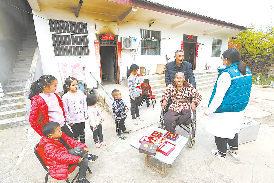 薛明德的侄子请医护人员为老人检查身体。