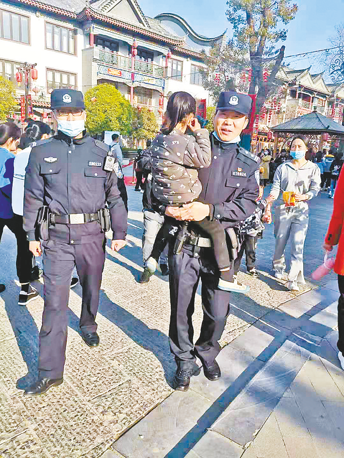 20分钟后,执勤民警孟辉在景区南街中间的路上找到了正在哭泣的女孩(如图),并把她送到奶奶身边。