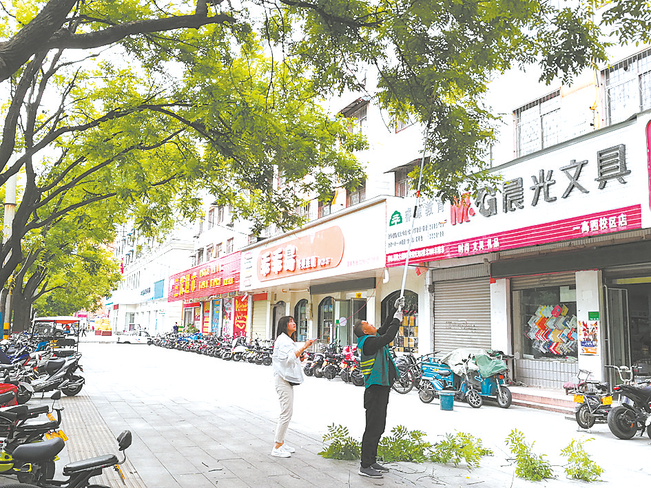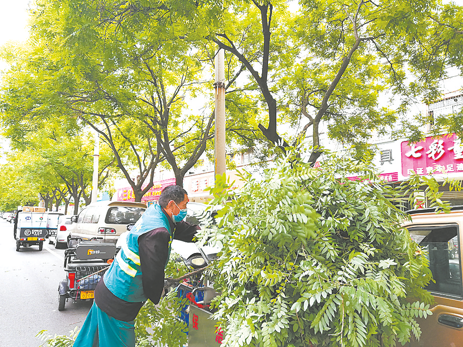 5月26日,记者在市区解放大道西段看到,几名园林工人正在修剪行道树的枝条。据其中一名园林工人介绍,这条道路上的国槐树比较多,夏天更是枝繁叶茂,有些枝条被雨水冲刷得低垂下来,影响行人和车辆的正常通行。