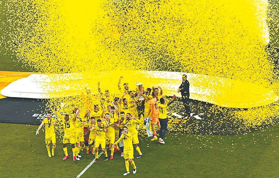 5月27日,比利亚雷亚尔队球员在颁奖仪式上庆祝。