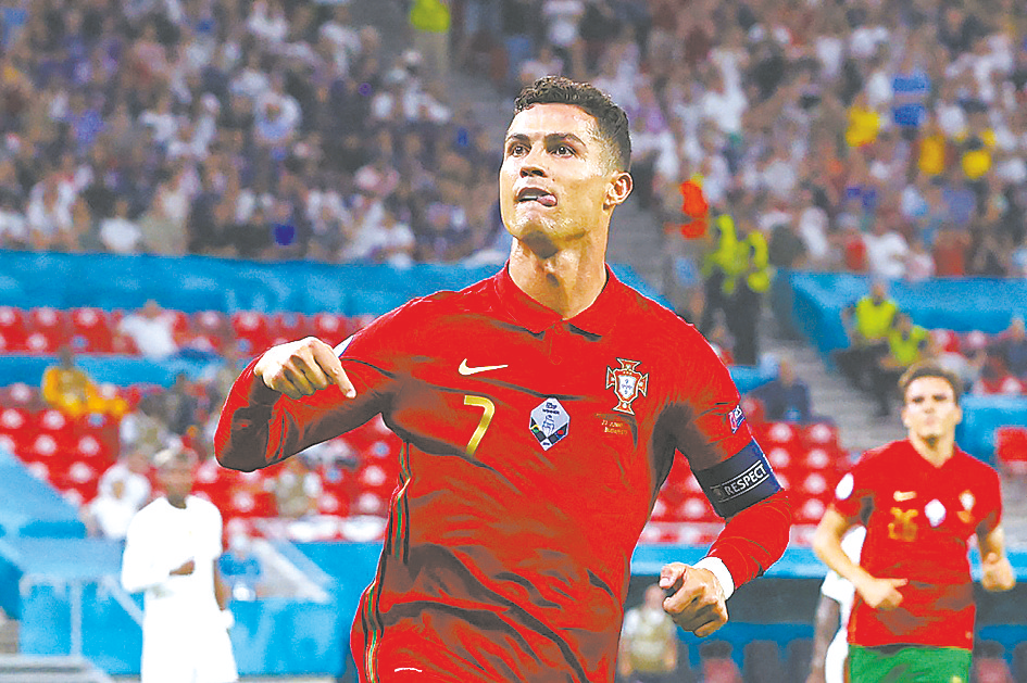 6月24日,葡萄牙队球员克·罗纳尔多在比赛中庆祝射中点球得分。