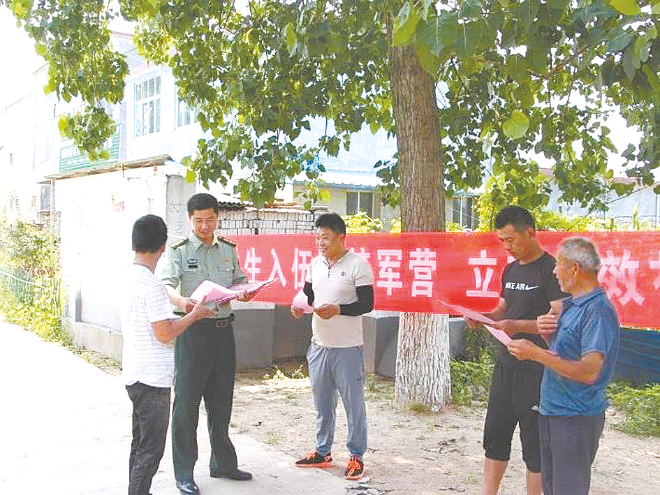 本报讯(文/图 全媒体记者 梅文辉 通讯员黄海洲)连日来,为让更多大学毕业生和家长充分了解大学生征兵优待政策,激发适龄青年参军热情,新蔡县河坞乡人武部组织人员走村入户进行征兵宣传。