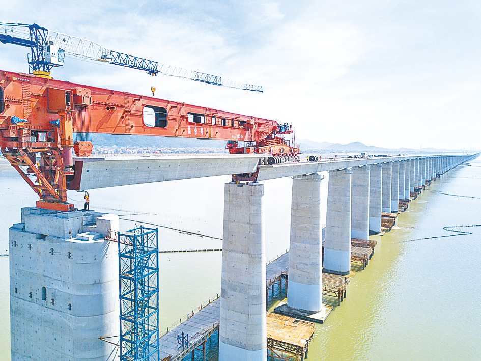 7月11日,在新建福厦铁路湄洲湾跨海大桥建设现场,中铁十一局工人协同“昆仑号”千吨级运架一体机架设该线路最后一孔40米箱梁(无人机照片)。