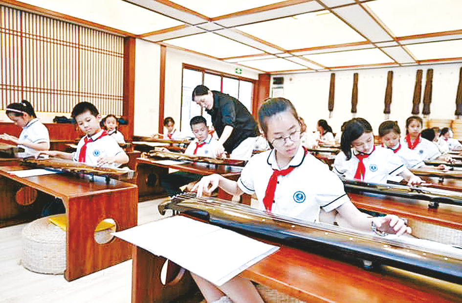 在福州市乌山小学,学生在参加课后古琴兴趣班。