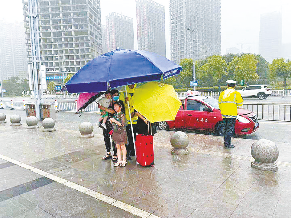 7月19日中午,暴雨如瓢泼一般。很多旅客乘车来到驻马店西站时,因雨太大而无法进站。市保安服务有限公司高铁中队辅警中队中队长田俊生发现这一情况后,立刻组织辅警队员为进站的旅客撑起特大号遮阳伞,保障旅客顺利进站。