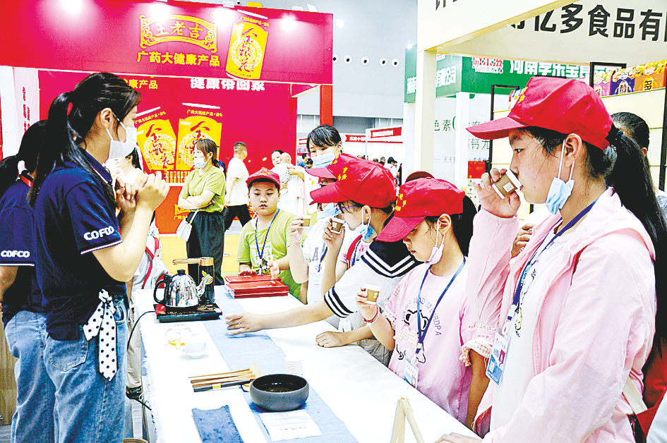 本报讯(文/图 全媒体记者王永良)“这些普洱茶都是产自于百年茶树吗?太好喝了!你看茶的颜色也很漂亮,是琥珀色的……”7月17日上午,在第三届中国食品交易会中粮旗下云南普洱茶展台前,工作人员将泡好的普洱茶让小记者们品尝,大家品尝着百年老茶树所产香茶惊叹不已。