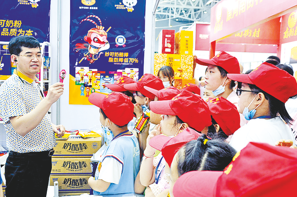 在来自郑州妙可奶业展台前,小记者对各类包装精美的奶酪棒产生了兴趣,主动向客商询问这些奶酪棒的品种和特点。闻到海南产的特色饮品“正宗椰汁”飘出的香味,小记者们忍不住咽了下口水,但是大家还是记录了相关内容后才在客商的盛情邀请下品尝了一番。