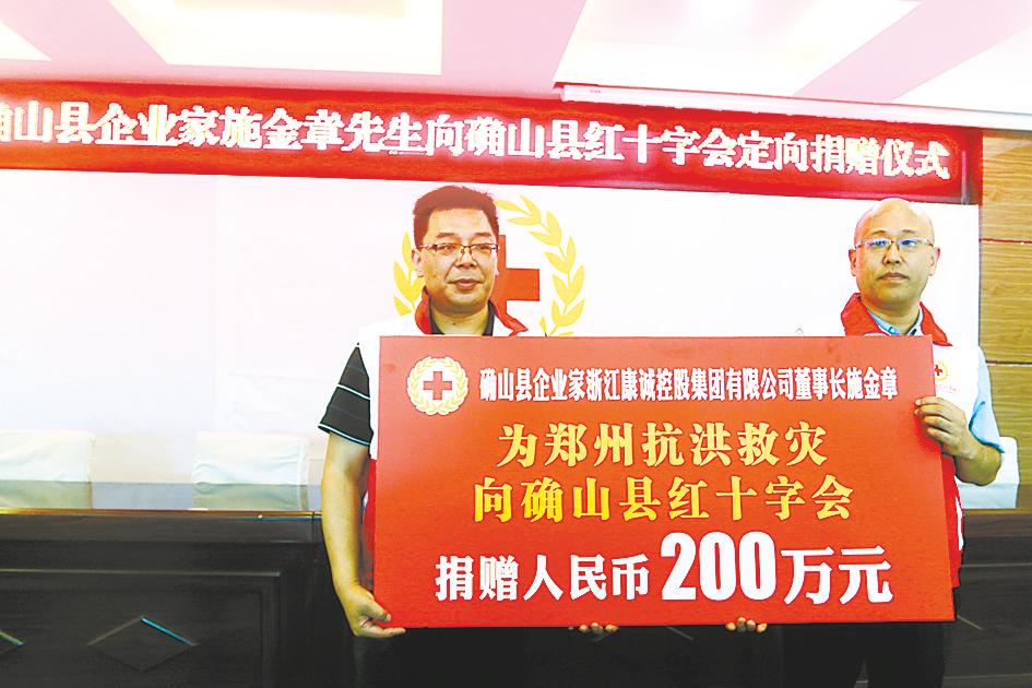 连日来,河南多地出现极端降雨天气,郑州等地遭遇特大水灾,灾情牵动全国人民的心。7月22日,爱心企业家——浙江康诚控股集团有限公司董事长施金章以个人名义通过确山县红十字会向郑州受灾地区捐款200万元,用于保障当地群众生命财产安全、采购救灾物资和灾后重建工作。