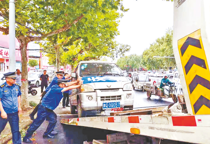 本报讯(文/图 全媒体记者 王永良)7月28日上午,在市区白桥路南段,驿城区城管局执法人员依法将一辆违规停放的无主面包车拖走(如图)。