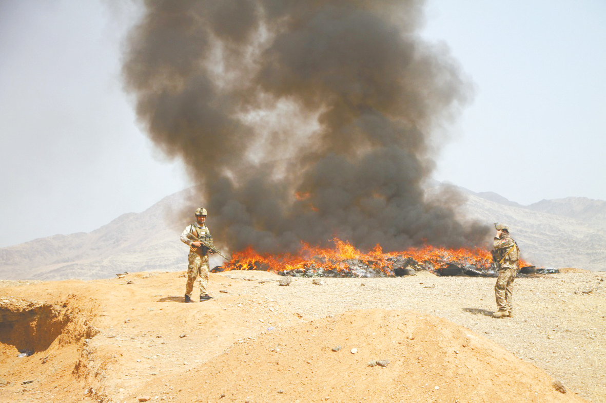 8月11日,在阿富汗楠格哈尔省,当地安全人员站在被焚毁的毒品旁。